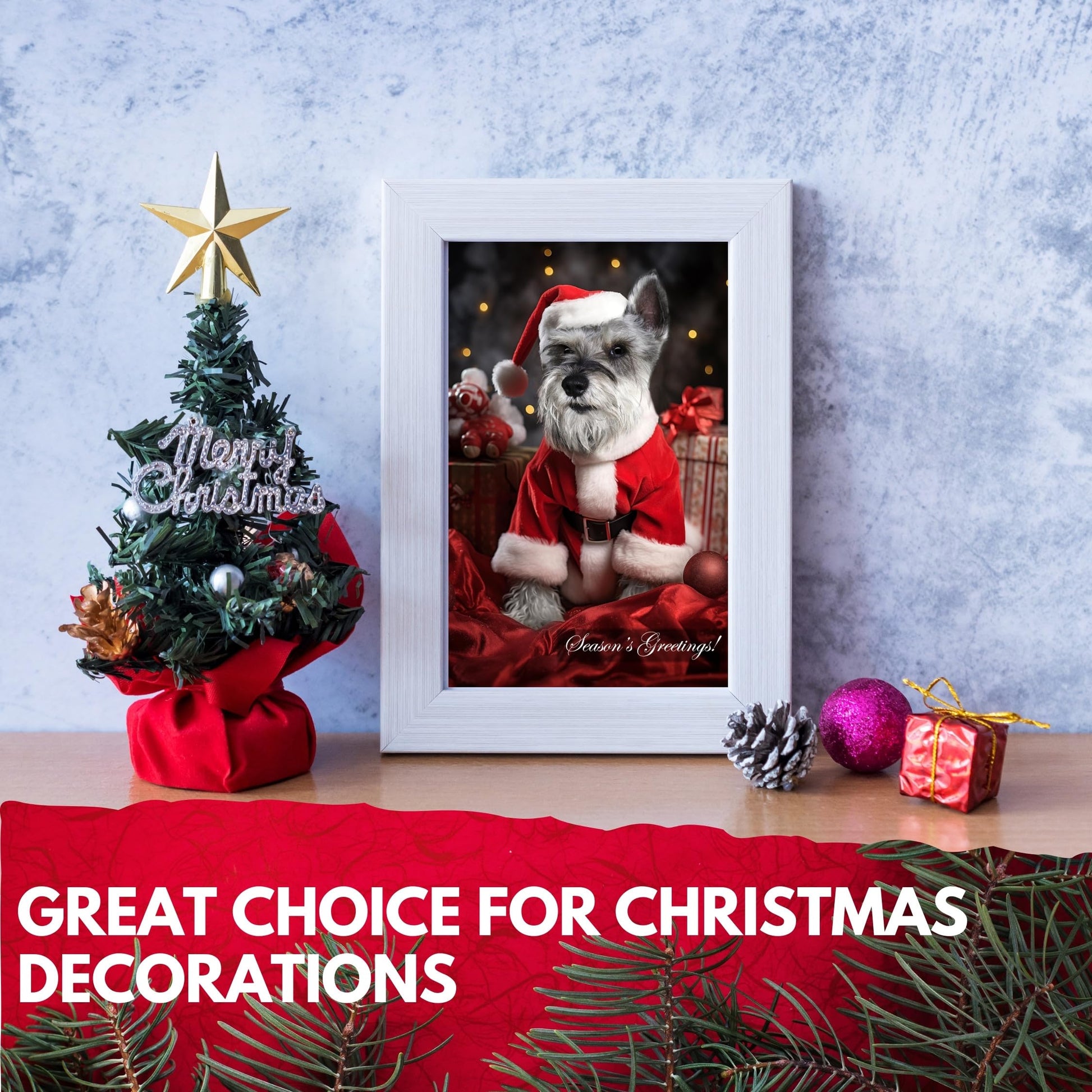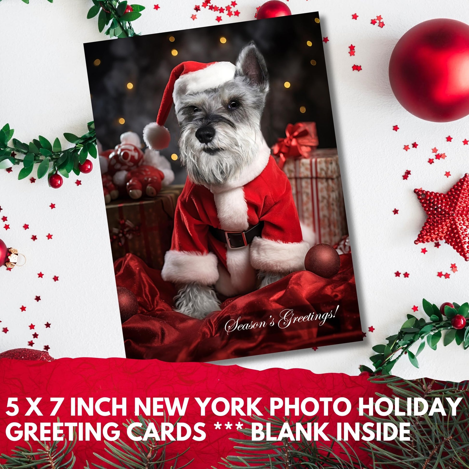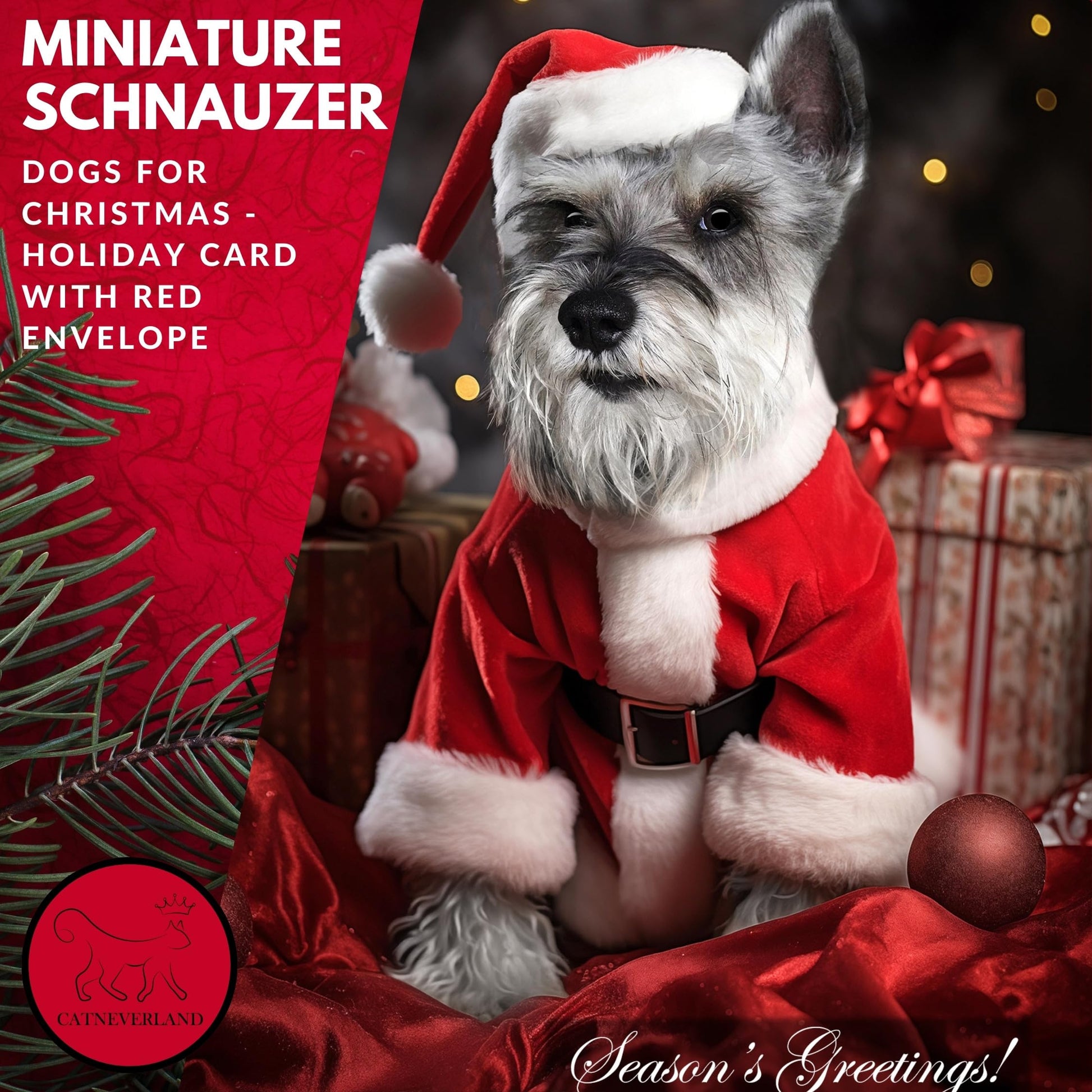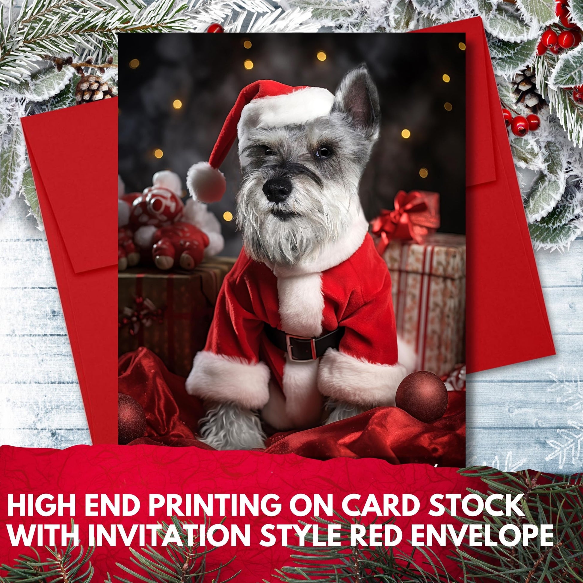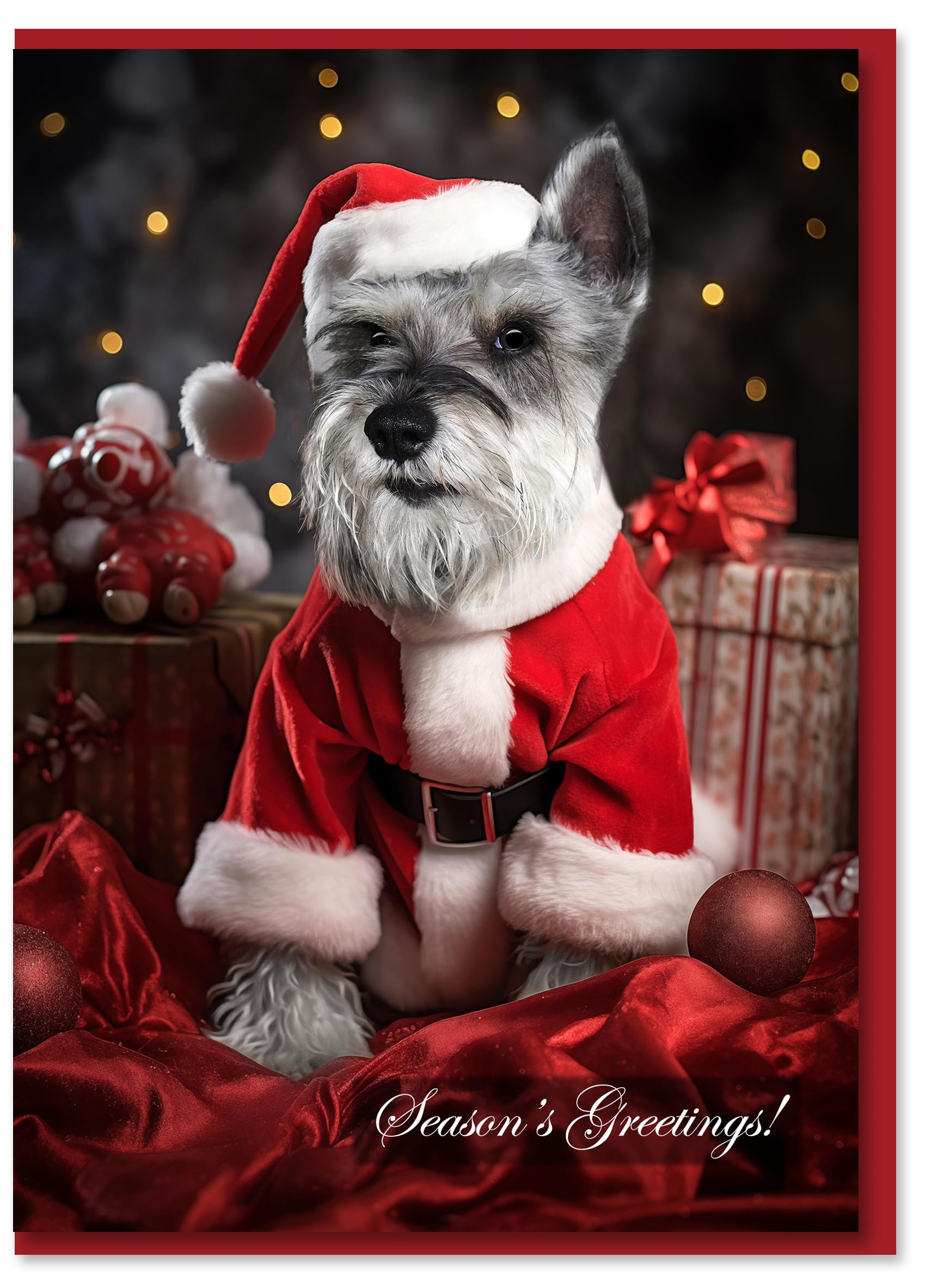 Capturing the holiday spirit with a festive Miniature Schnauzer design in a Santa outfit, this card is a charming addition to the Dogs for Christmas Collection. The blank interior allows for personalization, and the premium cardstock and high-end printing add to the quality feel. Includes a festive red envelope and proudly made in the USA by a pet-friendly small business.